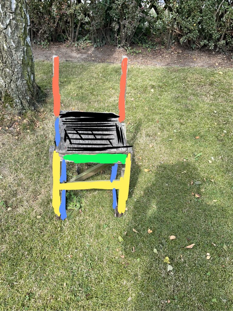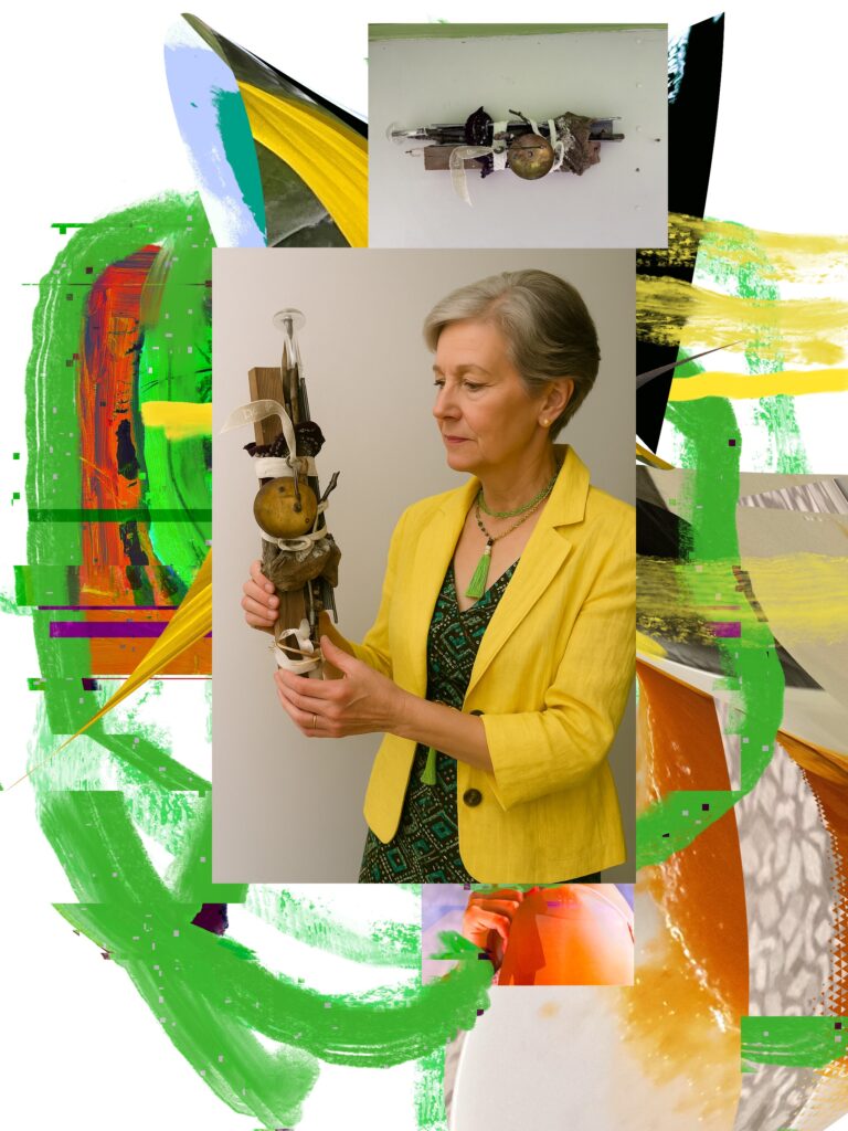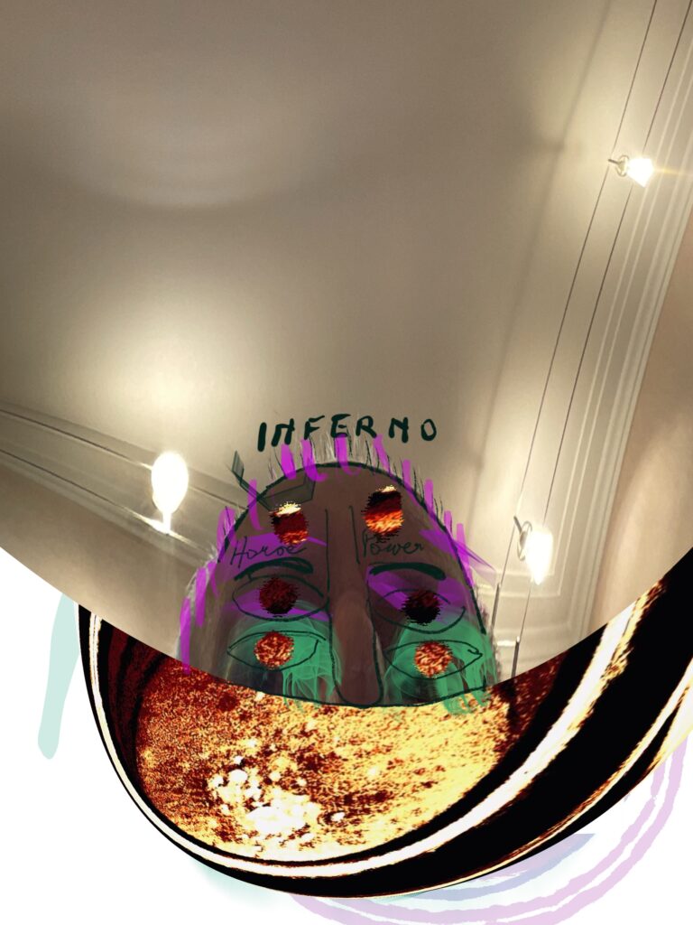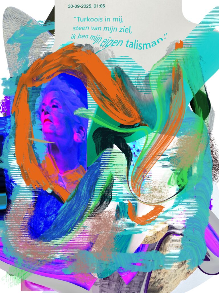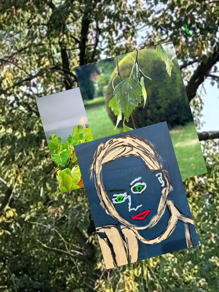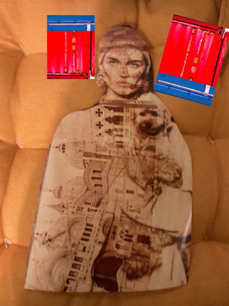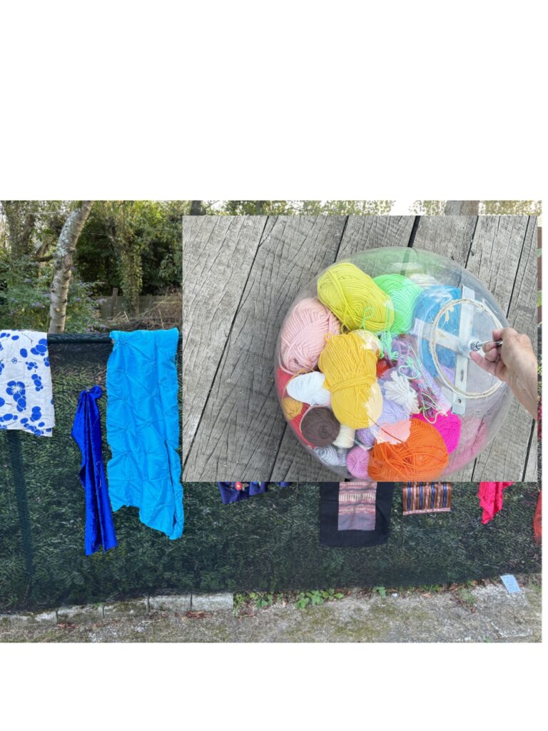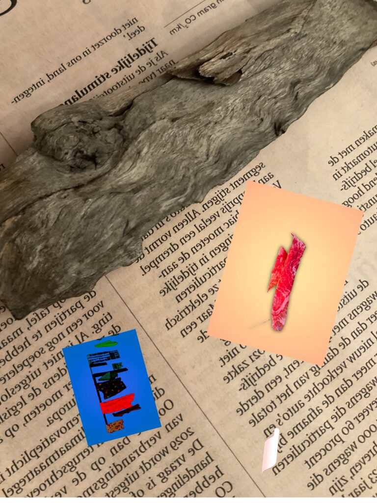 De luchters zijn van hout. Het hout van de ene luchter is afkomstig uit een Trappistenabdij. Ik schilderde er abstracte vormen op. De houtsoort van de andere luchter is afvalhout. Ik schilderde er de kleuren en vormen op van groenten, daarom hangt hij in onze keuken. Beide luchters zijn gemaakt in samenwerking met onze zonen.