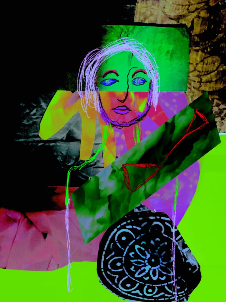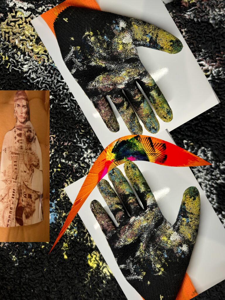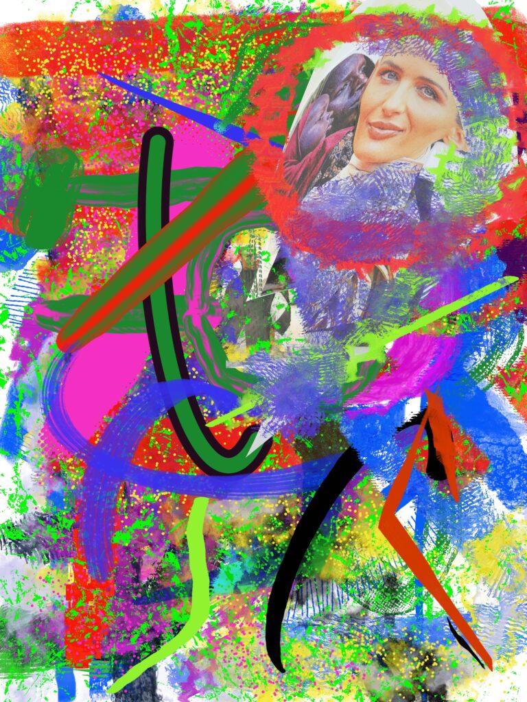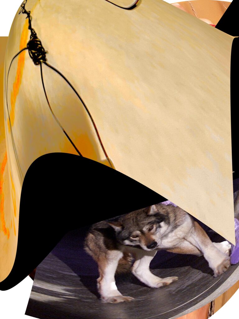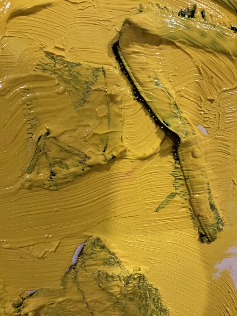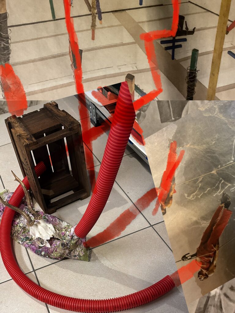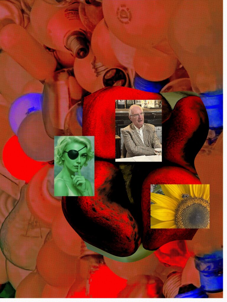 De luchters zijn van hout. Het hout van de ene luchter is afkomstig uit een Trappistenabdij. Ik schilderde er abstracte vormen op. De houtsoort van de andere luchter is afvalhout. Ik schilderde er de kleuren en vormen op van groenten, daarom hangt hij in onze keuken. Beide luchters zijn gemaakt in samenwerking met onze zonen.